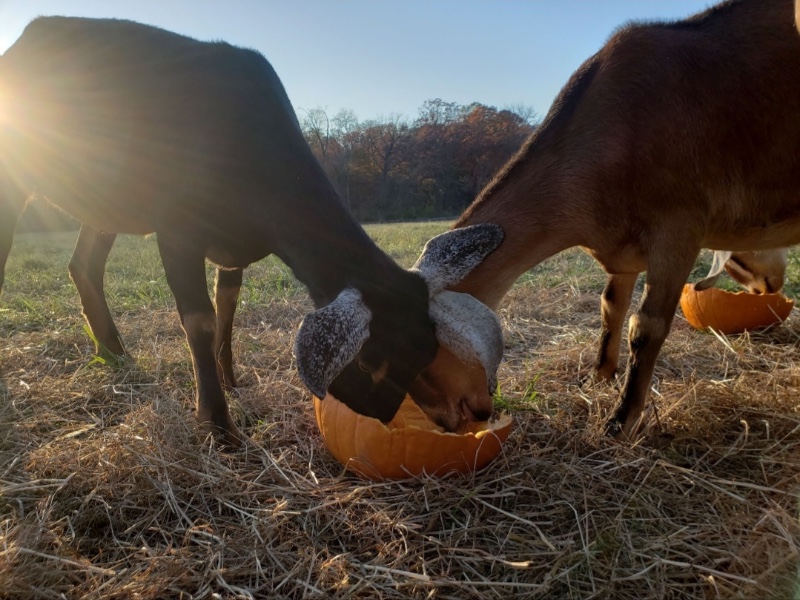 Two goats sharing a pumpkin at dawn at 56 Hooves. Photo: 56 Hooves.